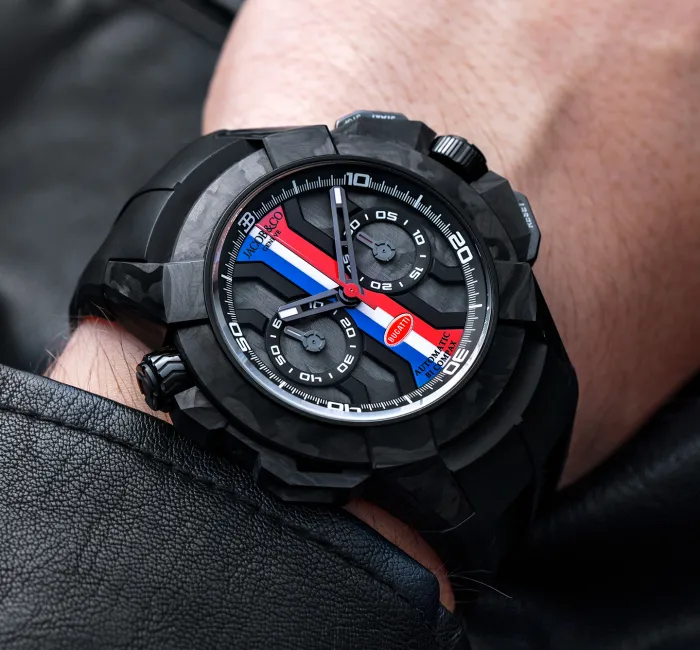 O mostrador bi-compax é personalizado com as cores da bandeira francesa e o icônico emblema da Bugatti, reforçando a identidade visual das pistas de corrida de forma direta e esportiva. É uma peça que equilibra a alta relojoaria com a funcionalidade de um instrumento de precisão, ideal para quem busca uma conexão imediata com o legado de velocidade da marca.