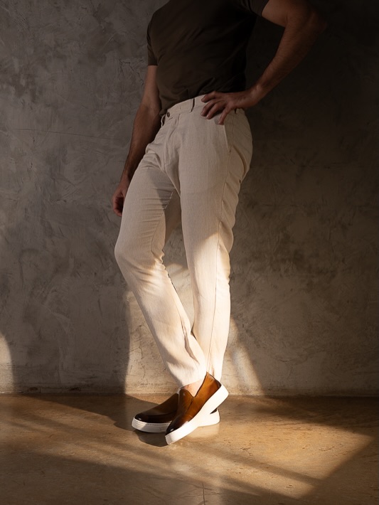 No guarda-roupa italiano, a parte inferior do traje recebe tanta atenção quanto a superior. A calça de alfaiataria em tons de cinza médio, bege ou areia é indispensável. A preferência é por tecidos que possuam textura, pois a textura adiciona uma camada de interesse visual que cores sólidas e planas não conseguem entregar.