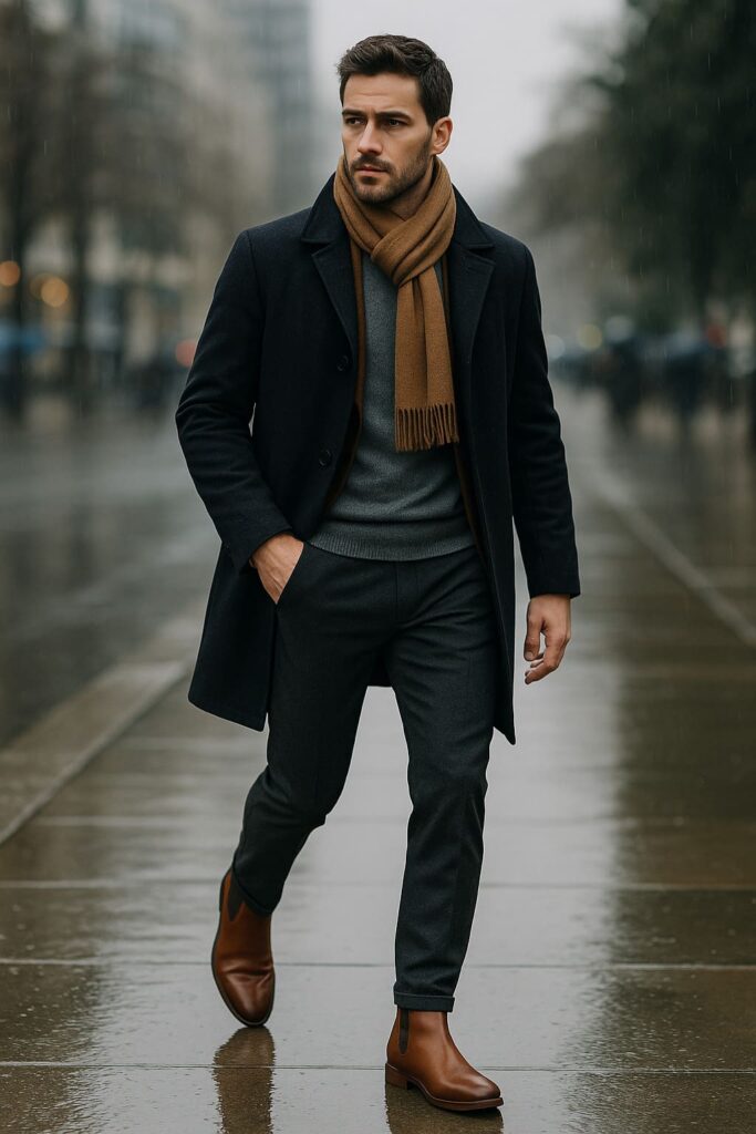 A escolha dos sapatos é vital em dias de chuva e frio. Botas de couro com solado de borracha oferecem proteção contra a umidade, além de garantir uma aderência segura em superfícies escorregadias. Modelos como as Chelsea combinam perfeitamente com a estética sofisticada, unindo praticidade e estilo. Certifique-se de que o calçado seja impermeabilizado ou de material resistente à água para maior durabilidade e conforto.