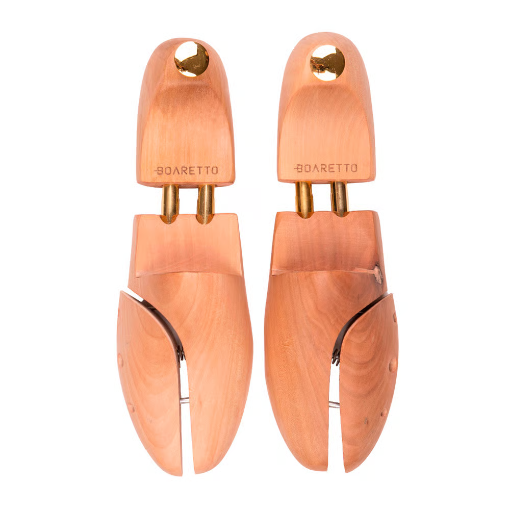 Para quem busca a excelência na manutenção, a fôrma de sapatos (ou shoe tree) é um item indispensável. Preferencialmente fabricadas em madeira de cedro não envernizada, essas peças desempenham duas funções vitais. Primeiro, elas mantêm a tensão correta do couro enquanto ele seca, evitando que as rugas de caminhada no peito do pé se tornem vincos profundos e permanentes. Segundo, o cedro é naturalmente absorvente e desodorizante, auxiliando na remoção da umidade e mantendo o interior do sapato fresco.