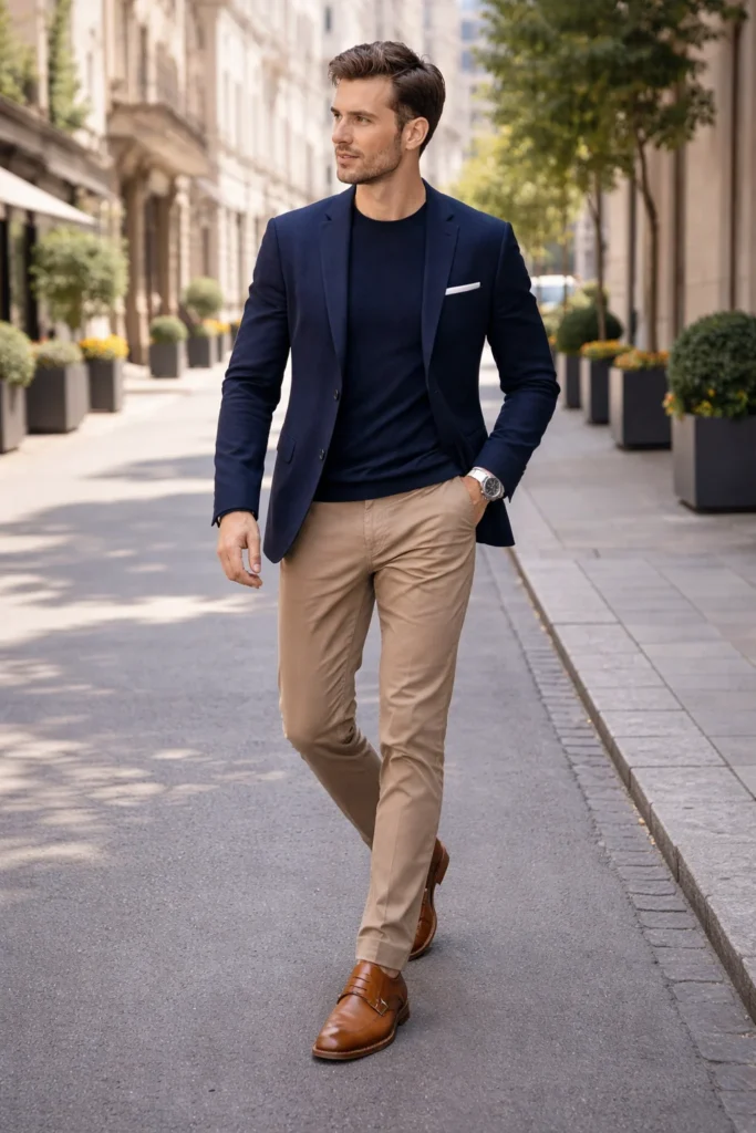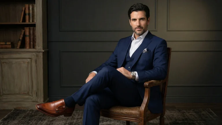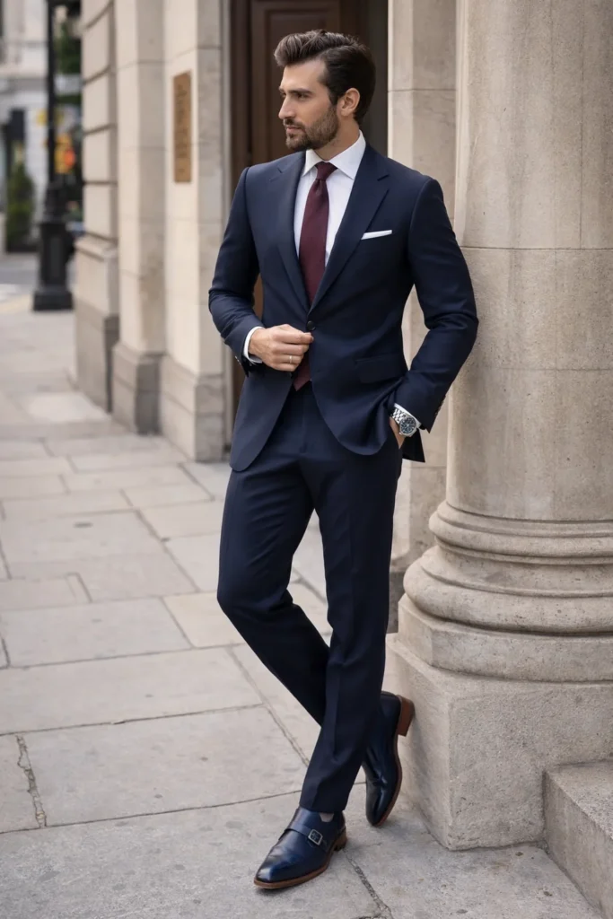 Em composições formais, o Monk Strap substitui o Oxford com vantagem estética. Ele harmoniza perfeitamente com ternos em tons de azul marinho, cinza médio ou risca-de-giz. As fivelas adicionam um ponto de luz e interesse visual que rompe a monotonia do traje executivo, comunicando autoridade e atenção aos detalhes.
